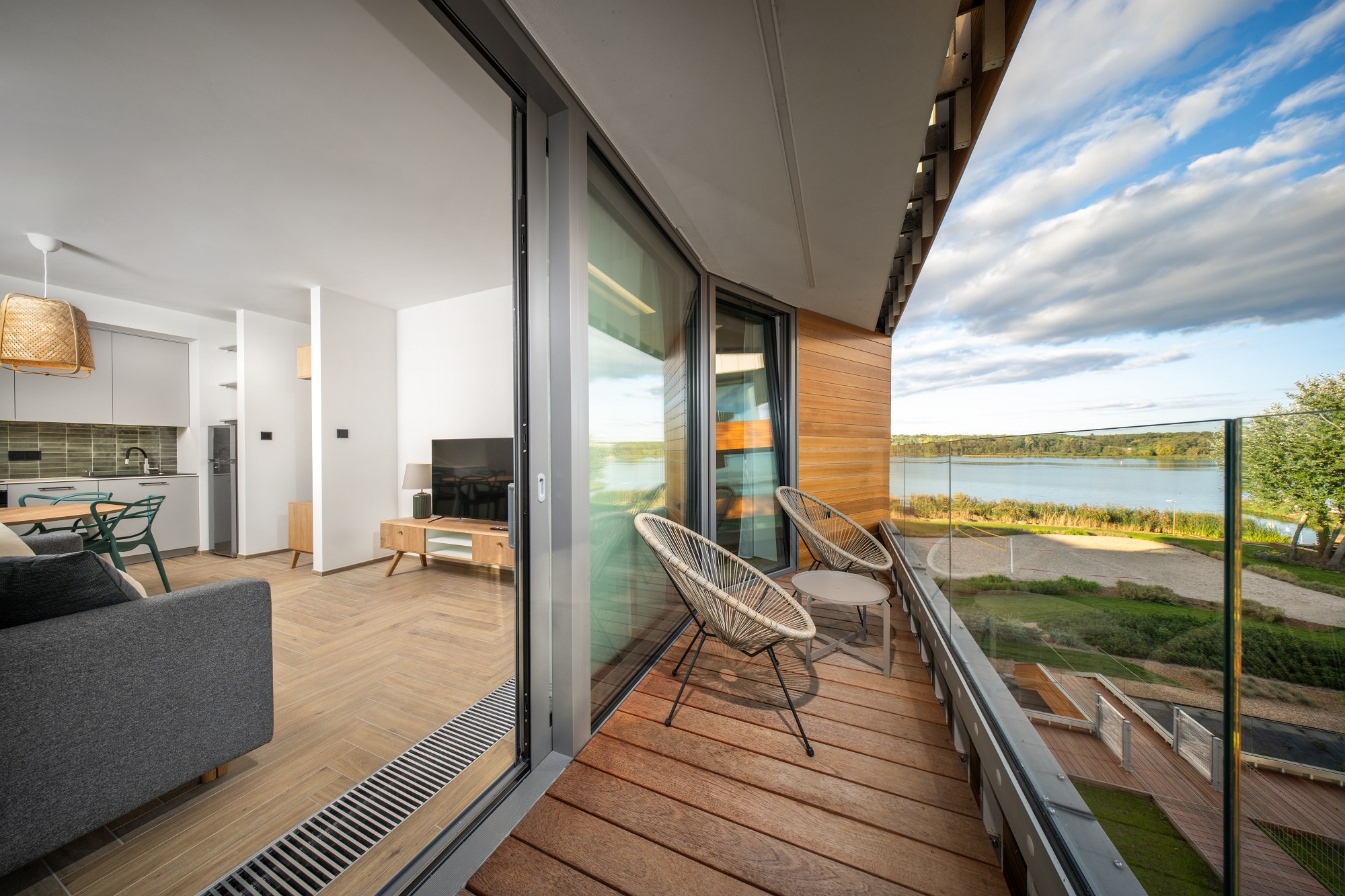 Prywatne tarasy i balkony z widokiem na wodę lub zieleń zapewniają komfort i poczucie prywatności.
